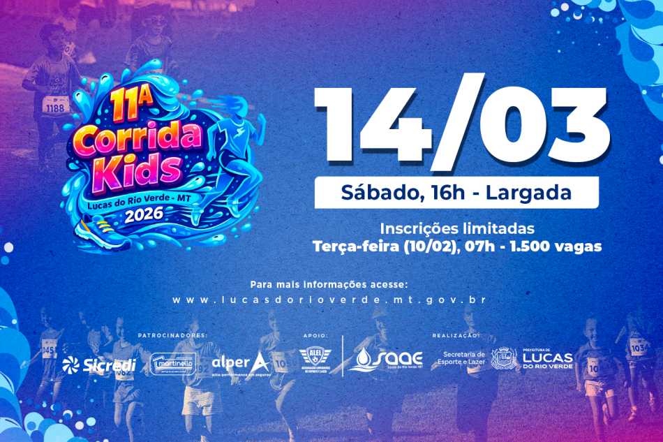 A partir dessa terça-feira (10), às 7h, estarão abertas as inscrições para a 11ª Corrida Kids, que será realizada no mês de março, em Lucas do Rio Verde. A prova é voltada ao público infantil, com faixa etária entre 5 e 14 anos, e contará com 1.500 vagas.