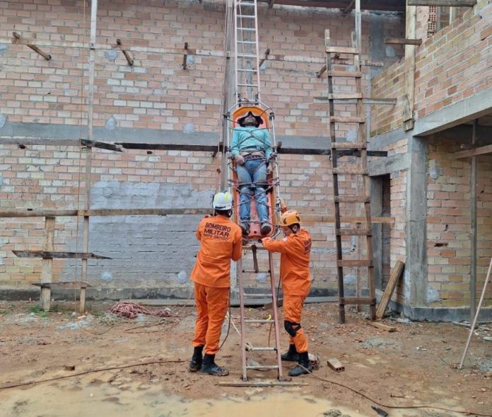 Ao chegar ao local, os bombeiros constataram que o trabalhador se encontrava a aproximadamente seis metros de altura, sobre um andaime da obra. Ele estava consciente e orientado, relatando intensa dor na região lombar e impossibilitado de se locomover.